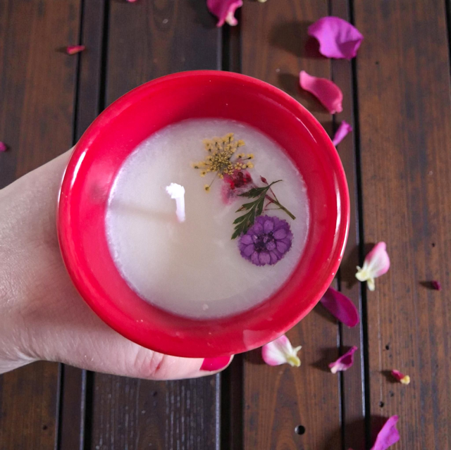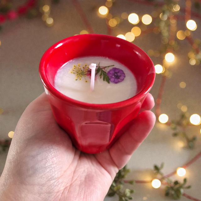 Rouge Expresso évoque l’intensité et la chaleur d’un moment caféiné. Coulée dans une petite tasse sans anse rouge de 7 cm de diamètre, cette bougie diffuse une lumière douce et réconfortante. Son décor de fleurs séchées naturelles ajoute une touche délicate et poétique. Une fois la bougie consumée, la tasse peut être réutilisée comme petit récipient décoratif ou objet pratique pour la maison.